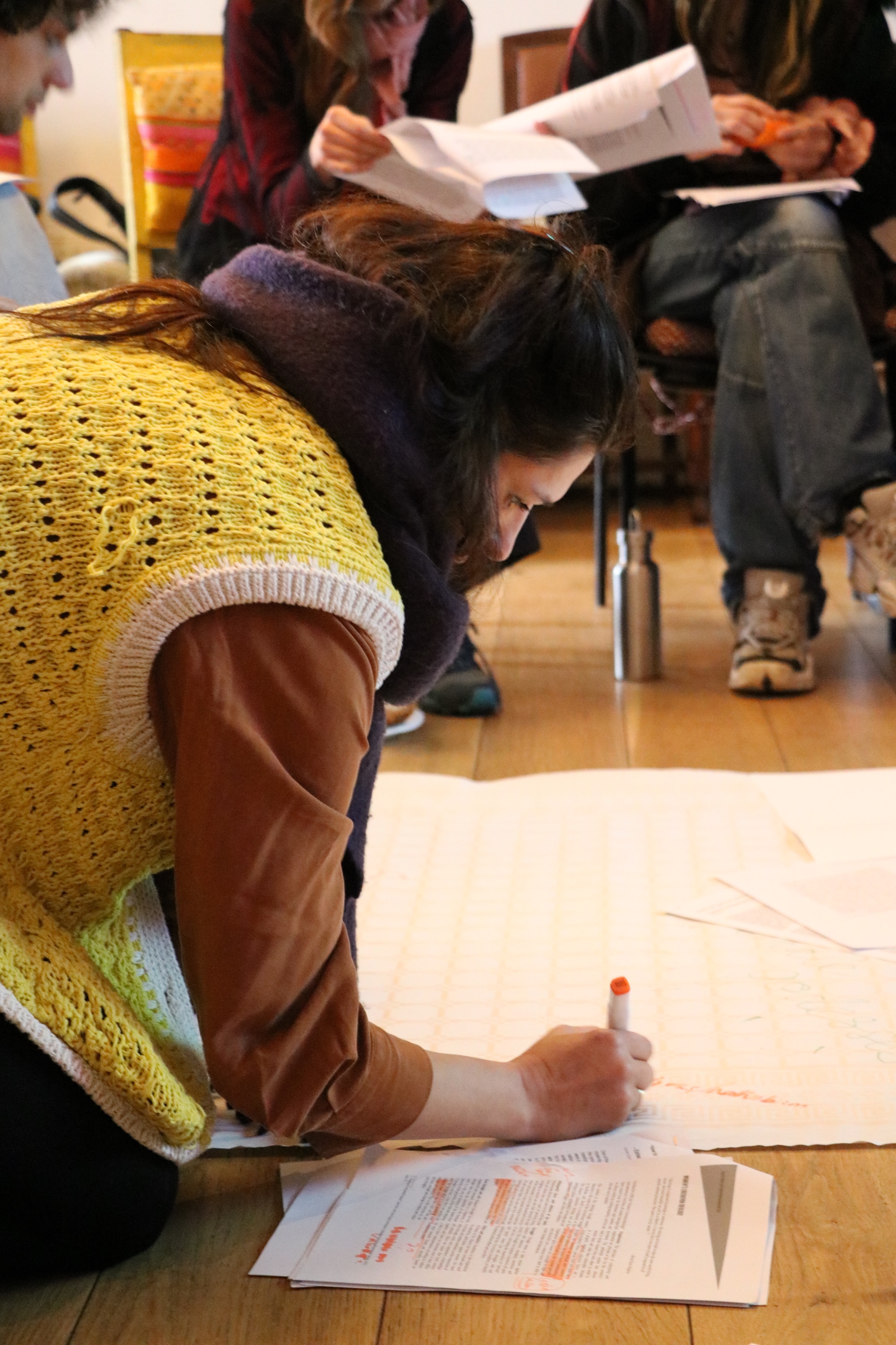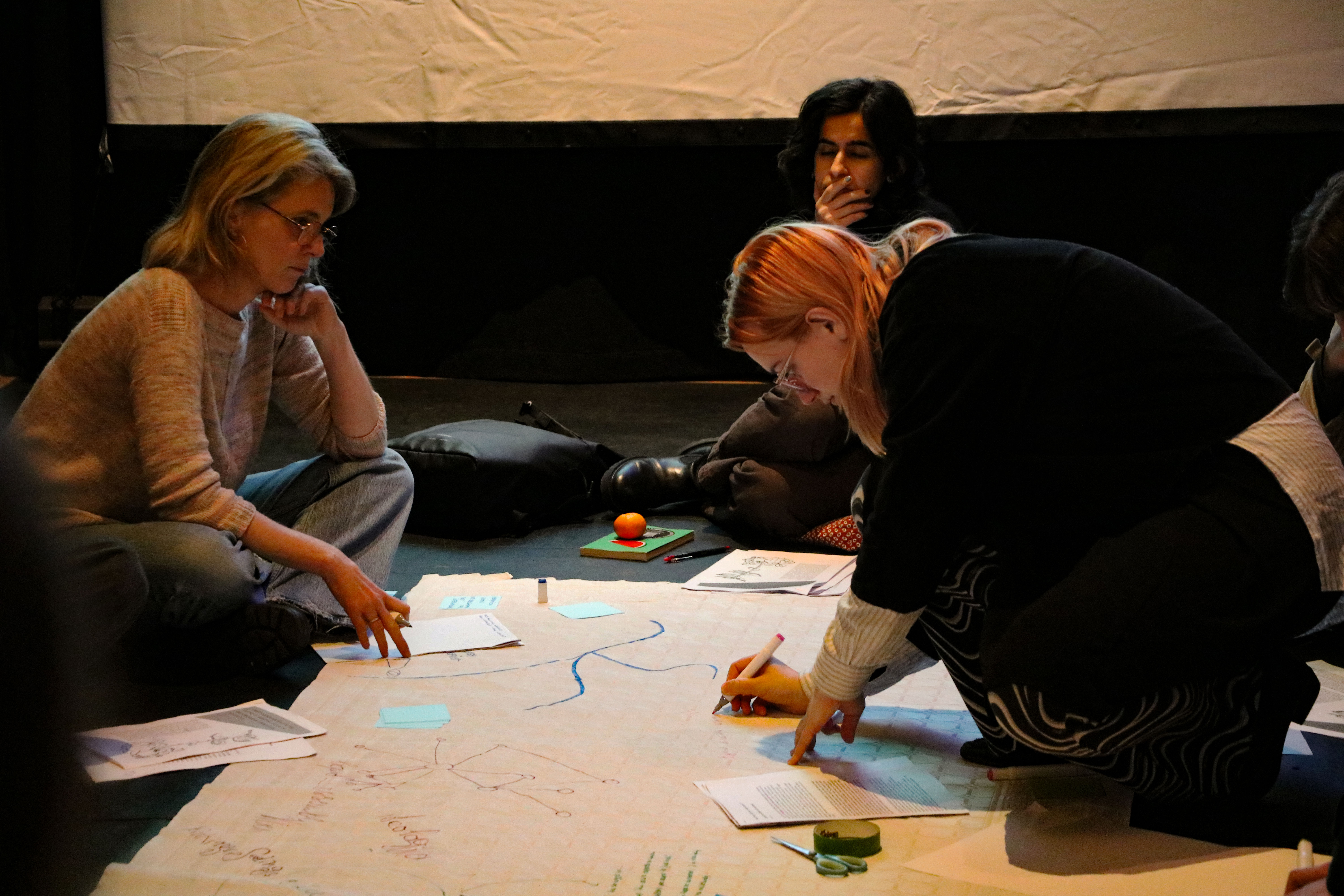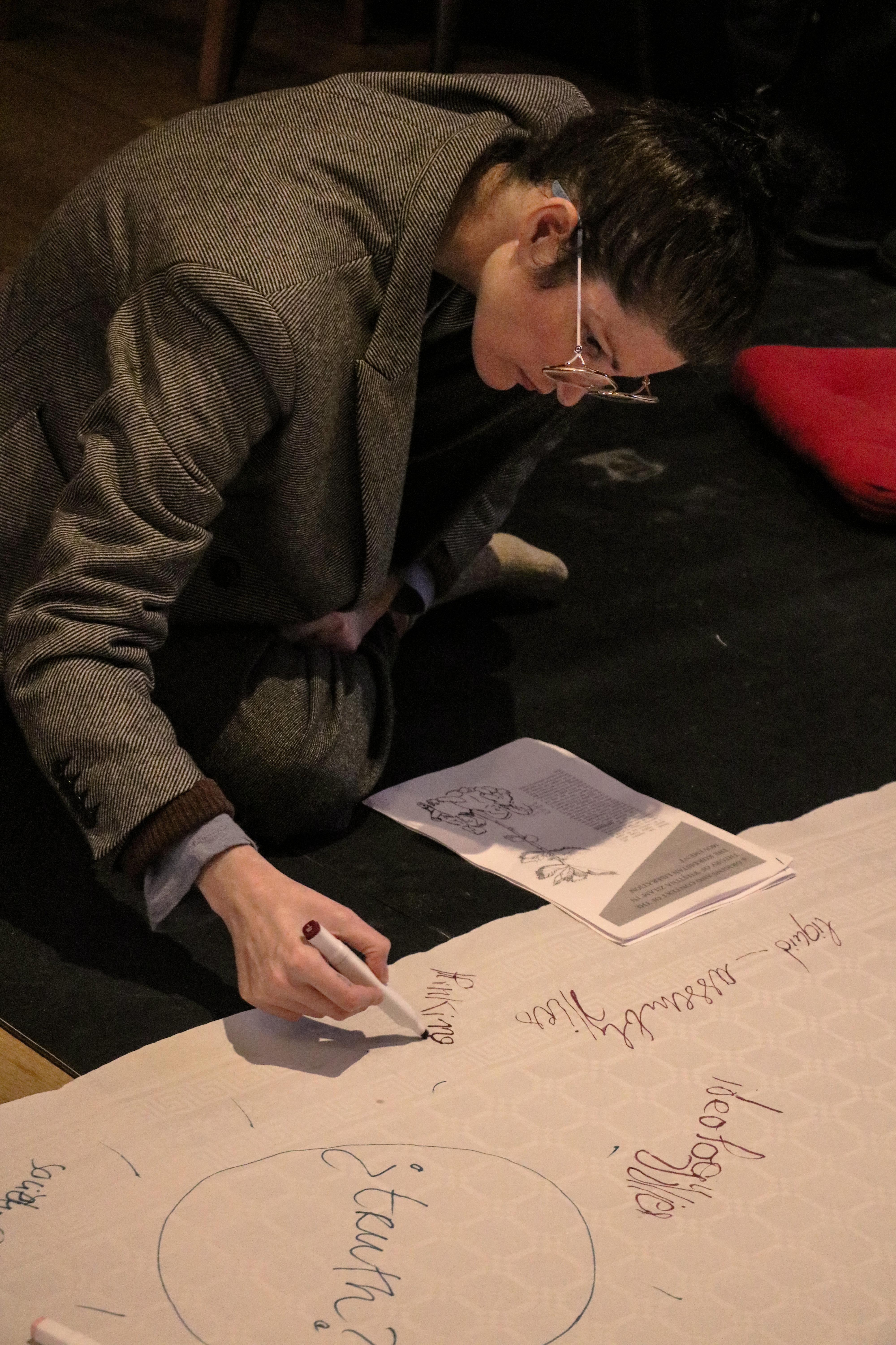Gathered around a large scroll of paper, participants collectively annotated the texts, deconstructing the figure of ‘the man’ and, importantly, brainstorming how we might organise and live otherwise.